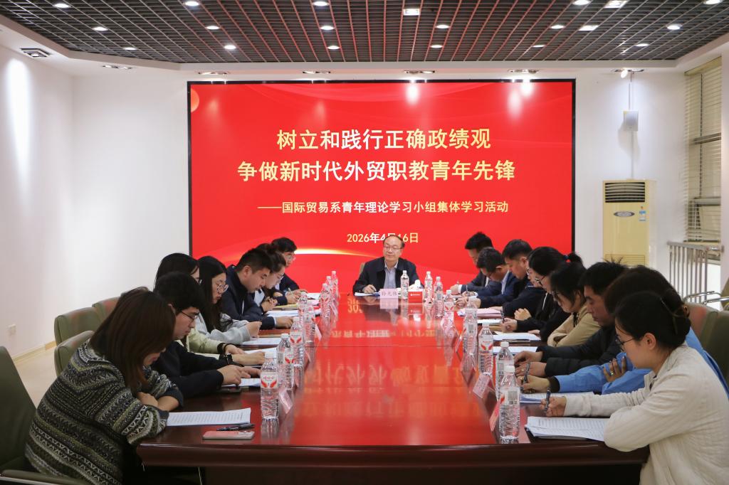 为深入学习贯彻关于树立和践行正确政绩观的重要论述,引导青年教师以实干担当推动外贸职业教育高质量发展,2026年4月16日,山东外贸职业学院国际贸易系青年理论学习小组以“树立和践行正确政绩观,争做新时代外贸职教青年先锋”为主题,在学院图书馆会议室开展第一季度集体学习活动。