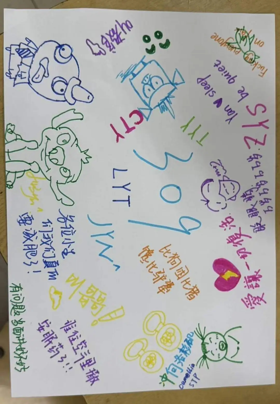 “宿舍公约”画一画:工作人员为每个宿舍发放空白纸张和水彩笔,同学们围坐在一起,一边讨论“作息时间怎么定”“卫生值日怎么排”,一边用画笔将约定变成生动的图文公约。有的宿舍画了可爱的闹钟提醒早睡,有的用笑脸图案标注“互相包容”,原本空白的纸张被色彩填满,就像一个个陌生的个体,在共同创作中凝聚成温暖的“宿舍大家庭”,既明确了相处边界,更埋下了集体意识的种子。