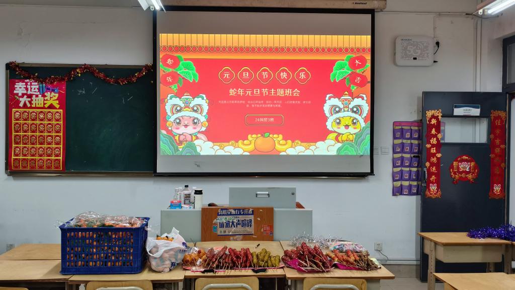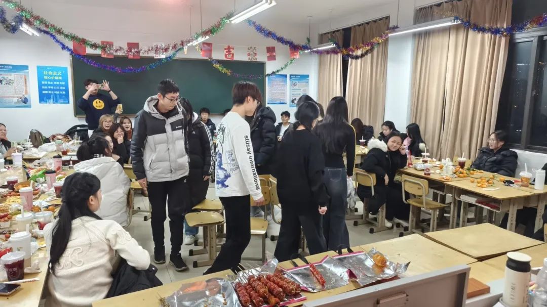 2024年12月26日晚,国际贸易系多个班级张灯结彩,热闹非凡,一场场充满欢乐与温馨的元旦晚会在各班教室精彩上演,各班师生汇聚一堂,共同迎接新年的到来。
