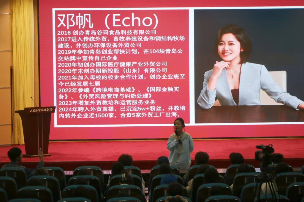 11月14日下午,国际贸易系在图书馆学术报告厅举办了“逐梦国贸人·校友大讲堂”专题活动第六期。活动邀请到朗新控股(山东)有限公司负责人、国际贸易系校友邓帆主讲,国际贸易系400余名学生参加。