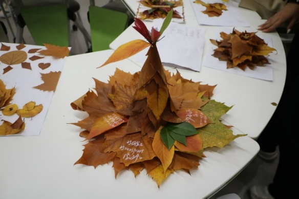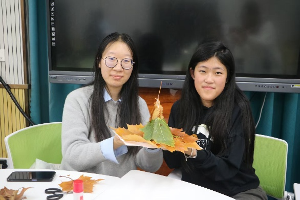 活动以树叶手工创作为核心载体,为学子们搭建了自由舒展创意、深度联结心灵的平台。同学们可自由组队碰撞灵感,亦可独自构思诠释巧思,作品形式不作任何局限,一张素纸、一片落叶,搭配胶水、剪刀等简单工具,便能成为承载心意与思考的创作素材。活动现场暖意融融,胶带轻轻撕拉的细微声响、树叶相互触碰的沙沙声、剪刀裁剪的清脆嚓嚓声,与同学们的轻声交流、会心欢笑交织在一起,奏响了人与自然和谐交流的温馨乐章。创作中,学子们细致观察每片落叶的形态,从平面拼贴画到立体小摆件,从具象造型到抽象表达,每一件作品都凝结着学子们对生命的理解,每一次裁剪粘贴都是与自然生命的深度对话。